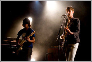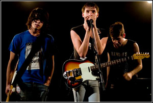 Ne se laissant pas décourager, le jeune trio frenchy déballe avec envie son punk-rock énergique. Leur musique zieute vers celle des défunts Rakes, les tubes en moins. Les membres du groupe ont tout l'air de se livrer en interne à une compétition du T-shirt rock le plus cool de la terre : Sonic Youth, Ramones, et notre préféré (arboré par le chanteur), reprenant le slogan "I'm A Bitch In Disguise" des Plasticines.