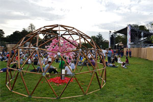 Suite du programme : confection de colliers de fleurs personnalisés, un attractif espace lounge avec coussins moelleux et coin à l'ombre, un bar pas comme les autres (bières hollandaises exceptées, tout est bio), un stand de bouffe pas comme les autres (maîtres mots : bio et végétarien, ça change des kebabs et sandwiches américains), deux mini-géodes en bois dont une abrite une expo photo, des toilettes sèches avec sciure de bois, un stand de crêpes bio...