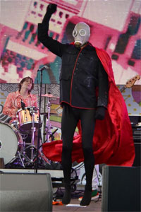 Les concerts des américains colorés convoquent en général un bestiaire et un cortège de personnages improbables. Le show d'aujourd'hui ne déroge pas à la règle : slam de superheros en collants rouge et noir, combat de catcheurs, jet de dollars dans le public, apparition de cochons sur scène, longue saucisse de ballons de baudruche dépliée dans le public... Le chanteur Kevin Barnes (très seyant en collants mauves, mocassins rouges et short blanc) et son guitariste en mode Woodstock s'en amusent. On en oublierait presque la musique. Avec une setlist centré sur Hissing Fauna..., Of Montreal régale et livre une performance enthousiasmante.
