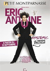 Révélation 2006 de l'émission télévisée "Incroyable talent", géant à l'ébouriffée houpette capillaire entre choucroute à la Marie-Antoinette et mousseuse moumoute du professeur Tournesol dressée par un souffle explosif, Eric Antoine, surnommé l'Humorillusionniste, le Prestidagitateur, le Grand Dépoussièreur de la Magie, a inventé une nouvelle déclinaison hybride du seul en scène, où ils sont d'ailleurs deux, qui tient du stand-up, du close-up et du burlesque.