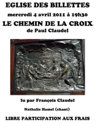 Lecture du Chemin de la Croix de Paul Claudel à l'Eglise des Billettes Le 4 avril 2012, François Claudel, petit-fils de l'auteur, propose une lecture de "Le chemin de la croix" avec Nathalie Hamel au chant.