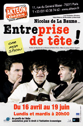 Nicolas de la Baume s'est concocté un one man show en forme de comédie à sketches à la fois parodique, caustique et burlesque sur, comme l'indique son titre, "Entreprise de tête", la thématique du monde du travail.