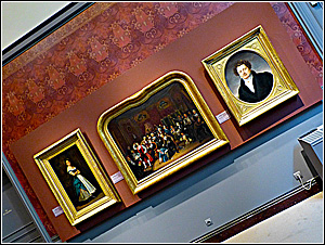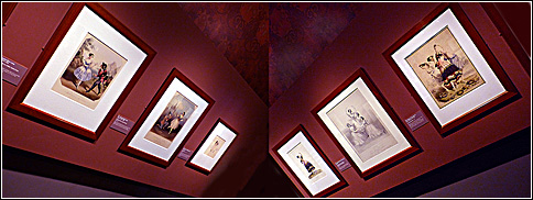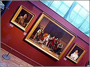 Pour les peintures, celui de Jean Roller ("La Parade de Bobèche et Galimafré") qui célèbre la pratique disparue de la parade immortalisée dont le théâtre de rue constituer une résonance contemporaine et les tableaux où le même personnage semble cloné à l'infini : ainsi Victor Darjou immortalise l'acteur Hugues Bouffé dans tous les rôles qu'il a joués durant sa longue carrière et de même pour le mime Debureau autour du buste de Pierrot sur une gravure de Baudet et Cornet.