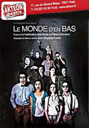 "Le monde d'en bas" est une adaptation du texte de Patrick Kermann : "La mastication des morts". Peut-on imaginer le séjour des morts ? quel est le chemin des âmes défuntes ? Est-ce que qu'on y reste lié par nos anciennes affections ? Est-ce qu'on peut veiller sur les vivants tels des anges gardiens attentifs ?La proposition de Jean-Baptiste Forest à travers Patrick Kermann est de rendre la diversité des vies : les morts sont soldats, footballeurs, professeurs, idiots, femmes aux désirs ardents, personnes âgées, poètes ou ivrognes. Une série de personnages qui s'expriment sur la vie, sur leur mort : suicide, assassinat, accident, mort subite.
