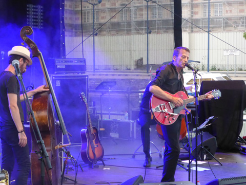 Ce samedi 18 juillet, nous avions rendez-vous le long du quai de la Meuse, entre péniches et bars, sous un beau soleil de plomb avec Louis Ville et Baden Baden. En première partie, le chanteur Lorrain accompagné par François Pierron (Loïc Lantoine) à la contrebasse et Pierre Le Bourgeois (Daniel Darc, Bertrand Belin, Jad Wio…) offre comme à son habitude, avec sensibilité et charisme sa musique intense, d’amours et de vies déchirées entre Léo Ferré et Lou Reed.