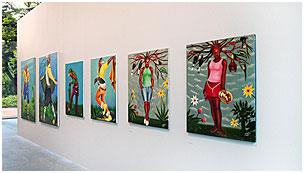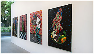 Né en 1980, J-P Mika utilise comme support des tissus décoratifs colorés et représente des couples ou des sapeurs, ces dandys africains, à grand renfort de paillettes.