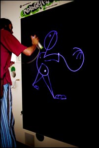 Vous tuerez le temps avec les joysticks en formes de pistolets reliés à un réveil vintage de Rogers Ibars ou vous exercerez vos talents avec la bombe à grapher du Studio Digit qui est en réalité un capteur à ultra-sons permettant de dessiner ou d'écrire en lumière.