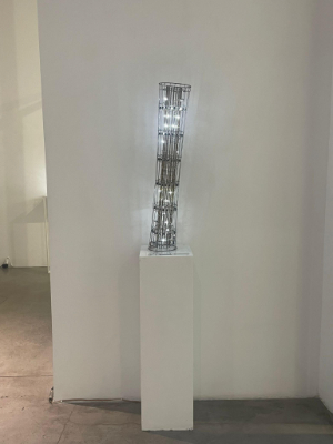 À l'inverse, Alain Le Boucher ne sculpte pas le mot mais la lumière. Ses Luchrones, structures délicates en fils d'aluminium où des diodes s'animent selon des algorithmes secrets, composent des partitions lumineuses infinies. Chaque sculpture devient un organisme vivant, pulsant et changeant, offrant au spectateur une expérience unique, comme si la lumière elle-même improvisait une danse silencieuse.