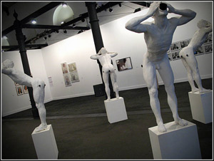 La scénographie sobre et épurée sur cimaises blanches, revêt, de facto, un caractère hautement symbolique dans ces pavillons qui ont conservé certains équipements d'abattoir comme les rails aériens et les crochets.