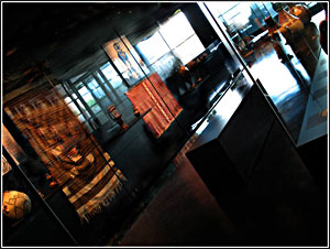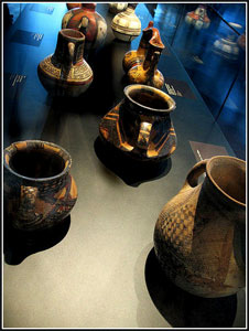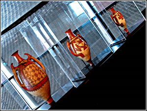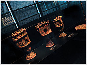 Dans une scénographie classique sous vitrines, les pièces sont présentées sous un éclairage ambiant très tamisé, presque crépusculaire, avec des lumières focales qui rehaussent leurs couleurs lumineuses terriennes.