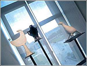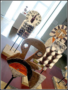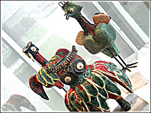 Fantaisie et exploration des matières pour ses "Idoles" petites sculptures qui tendent également à la fois vers une abstraction géométrique et des hybridations comme ses oiseaux-fleurs.