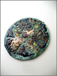 Dans la tradition de l'âge d'or de la faïence européenne de la Renaissance, Guidette Carbonell puise son inspiration dans les récits bibliques et mythologiques peuplés de figures légendaires et d'animaux emblématiques qui vont au fil des années constituer un bestiaire symbolique.