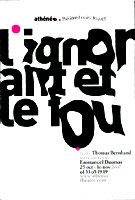 "L'ignorant et le fou" de Thomas Bernhard traite de l'amour de l'art et de la fascination de la mort, de l'instrumentalisation des corps et du dévoiement de la science organiciste et des processus d'anéantissement de la société dans laquelle l'homme n'est plus que sa représentation.