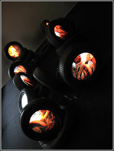 Ici, l'installation simplissime, des pneus et des photos couleur du feu, symbolise les crématoriums artisanaux, fabriqués avec des pneux arrosés d'essence, dans lesquels sont brulées vives les vicitmes de la guerre des gangs et des trafiquants de tous poils.