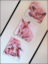 Inspiration bucolique pour Tiphaine Liébaud qui ne prend pas de gant pour donner vie à ses tendres petits cochons rose qu'elle peint avec les mains. Tendres, dodus et débonnaires, ils s'appellent Jean, Hyacinthe, Eugénie et se laissent tirer le portrait avec bonhomie.