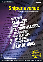 Le Studio Casanova d'Ivry ouvre sa saison avec "Sniper avenue", un texte de Sonia Ristic, construit à partir de témoignages de citoyens de Sarajevo, qui est le lauréat 2006-2007 du concours Nouvelles Ecritures organisé par le Théâtre de Cachan, le Théâtre des Quartiers d'Ivry et la Scène Watteau, qui vise à promouvoir, en associant le public, l’écriture héâtrale contemporaine.