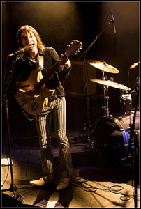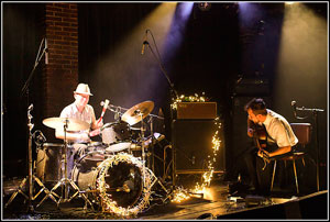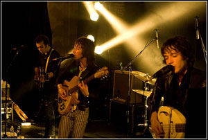 Un batteur chapeauté, un guitariste élégant et trapu et un guitariste/chanteur muni d'un drôle de pédalier (ressemblant à des pédales d'orgue) qui restera assis tout le long du concert. Assis mais expressif et charismatique, arcbouté sur sa guitare, il se redresse pour chanter en alternance avec le second guitariste rappelant en cela un certain David Eugene Edward.