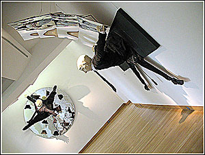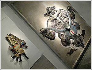 Laminés, ils composent d'étranges assemblages muraux à l'esthétique parfois proche des illustrations surannées et des marionnettes de carton pour un théatre de papier dont l'aspect ludique ne dissimule pas le côté tragique ("La danse des prolétaires").