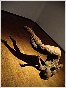 Ainsi en est-il avec "Tumbling woman II", figure féminine en suspension dans l'air, posée au sol simplement sur la nuque, réplique d'une commande du Rockefeller Center pour la célébration des morts du 11 septembre 2001 qui fit scandale, traduit de manière si suggestive le moment de l'impact dont le mental de celui infère l'écrasement qui doit suivre.