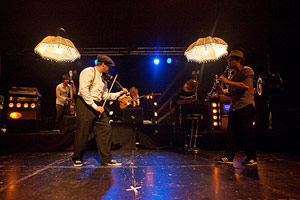 La soirée se poursuit à "l'Ephémère", pour un véritable retour en arrière d'au moins 70 ans. L'atmosphère est tout à fait rétro, avec des abats jours un peu vieillots, des musiciens habillés à la mode bretelles/ chapeaux melons-bérets, et une chanteuse aux gants noirs et à la voix langoureuse. Caravan Palace allie le jazz manouche à l'électro dans un swing retentissant. Contrebasse, violon, guitare, clarinette, chant et machines ne sont pas de trop pour créer ce mélange décalé et sans nul doute très original.