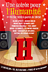 Le 1er février 2010 se déroulera au Bataclan une grande soirée musicale pour soutenir le quotidien l'Humanité. L’occasion de faire la fête avec, entre autres, Jacques Higelin, Bernard Lubat, Allain Leprest, Yves Jamait, Archie Shepp, Francesca Solleville, Sapho, La canaille, La Fanfare Krakens, Sidney HIP HOP... pour 15 euros.