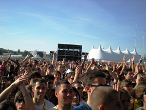 Après un début d'après-midi passé à chercher de l'ombre et à roupiller, nous entamons cette deuxième journée par une visite du site : village des associations, manèges, scène France 4, stand des produits laitiers, boutique Solidays. Alors qu'une queue monstre patiente sous le soleil pour le saut à l'élastique, nous prêtons une oreille au groupe afro Fanga, qui envoie du jus sur la scène Bagatelle. Rythmes syncopés et improvisations inspirées : Fanga est une bonne introduction à la venue demain de Femi Kuti.