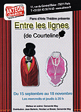 La jeune et bien nommée Compagnie Pans d'Arts présente, fondée par Gersende May, formée au cours Florent et à l'Ecole du Théâtre National de Chaillot, et Nicolas Le Bossé formé à l'Institut d'Etudes Théâtrales de Paris 3 Censier, présente "Entre les lignes (de Courteline)", un spectacle dans lequel ils ont manifestement laissé libre cours à leurs envies scéniques.