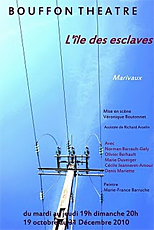 La Compagnie du Bouffon Théâtre s'approprie le texte de "L'île aux esclaves" de Marivaux, en privilégiant la gestuelle et le travail du corps, dans une mise en scène ludique. Simplicité et naturel sont les maitres mots de ce spectacle: scène nue, animée d'un horizon lumineux et tourmenté (œuvre de l'artiste-peintre Marie-France Barruche), costumes de lin, de coton, tons naturels.
