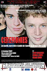 "Cérémonies", c'est en premier lieu, un texte de Dominique Paquet, un texte littéraire, puissant et poignant qui explore les territoires de la psychopathologie de l'adolescence.